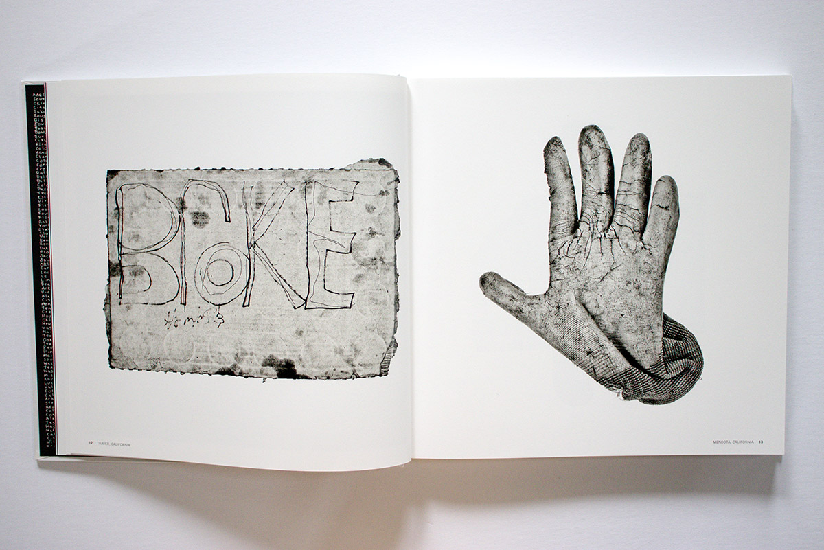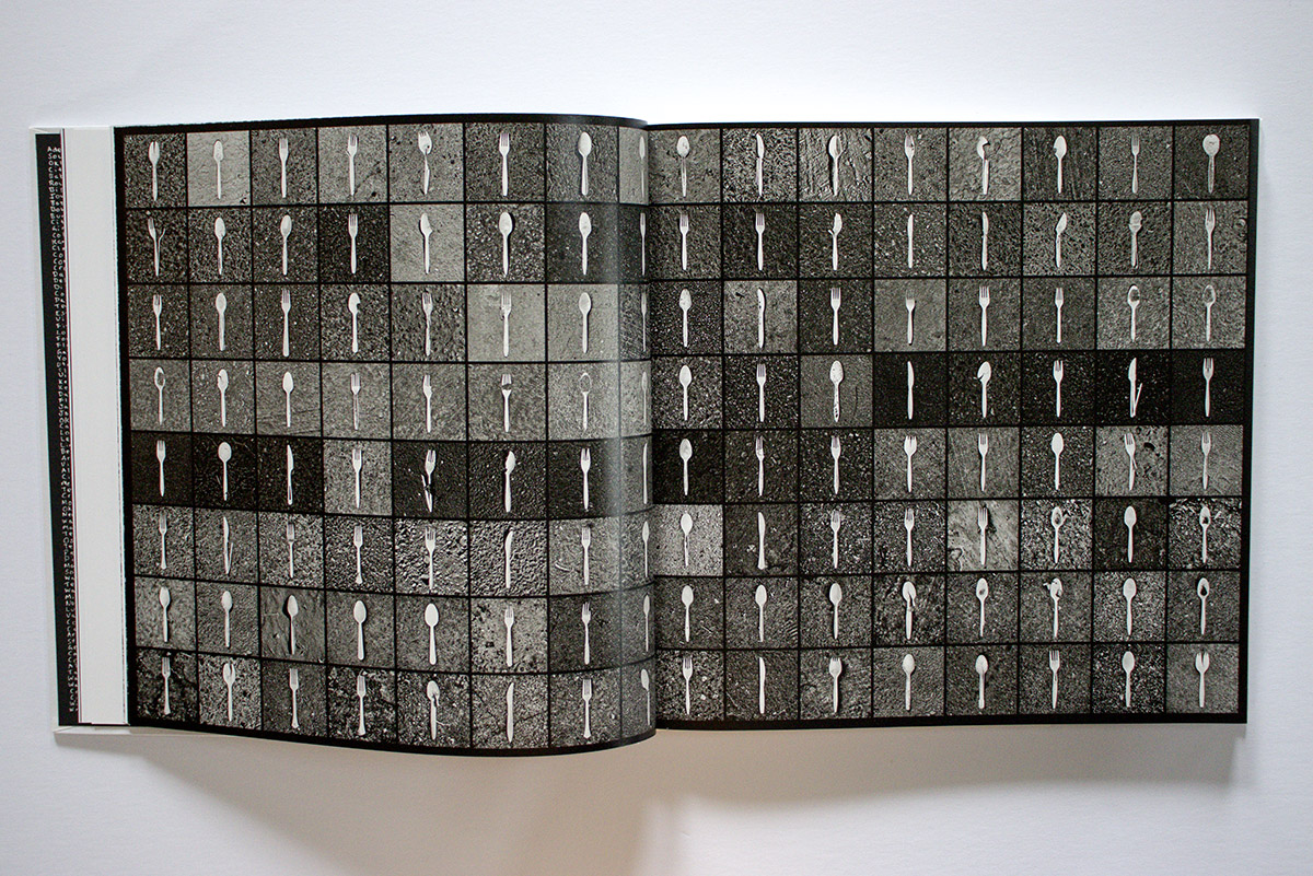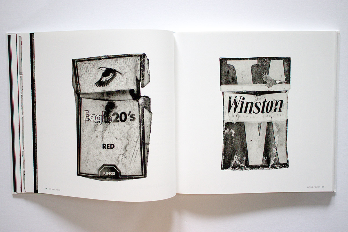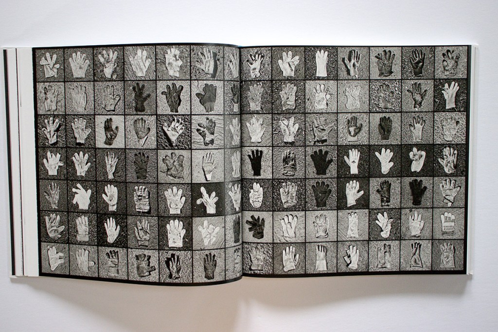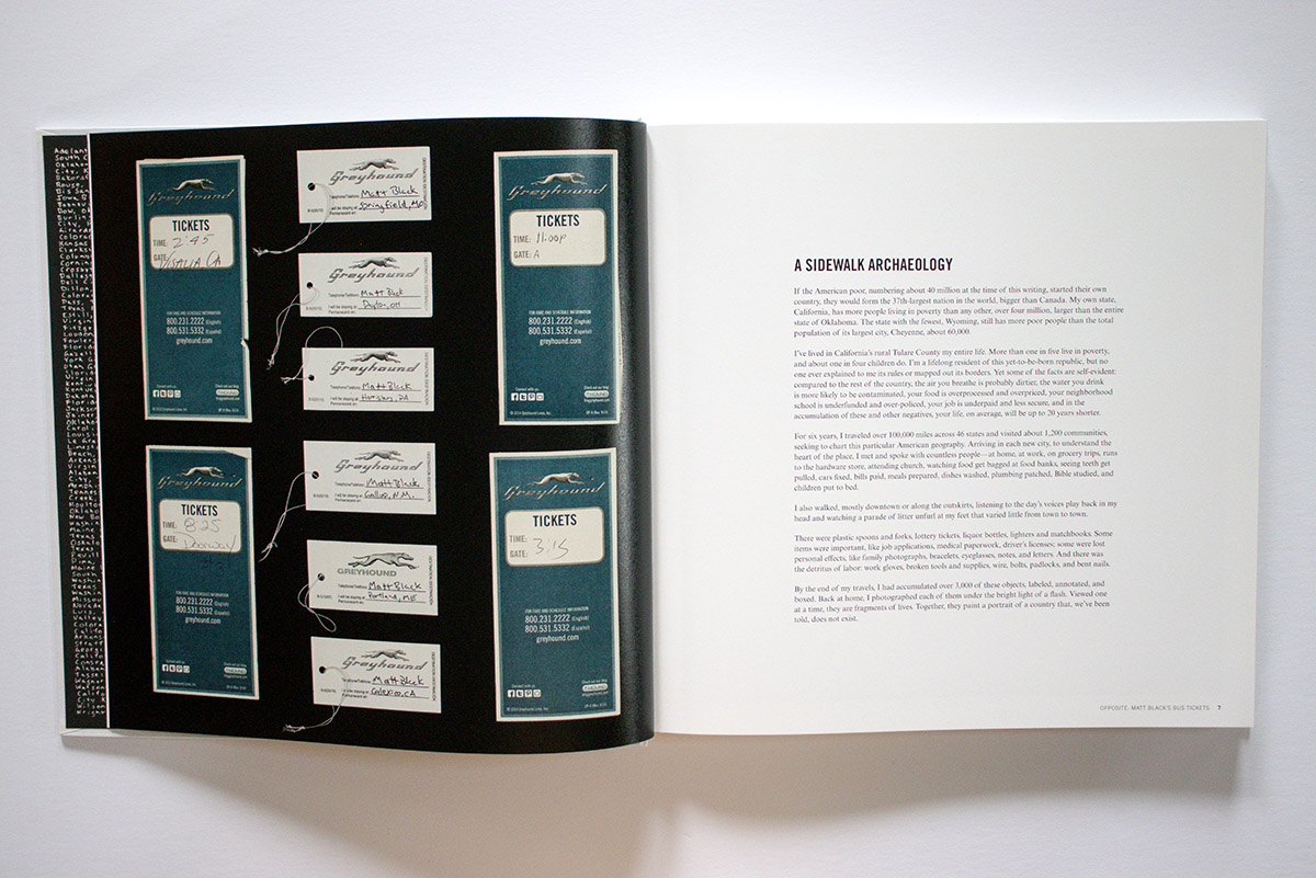 Woven between these sections are Black’s photographs. They are black and white and are presented in a variety of formats. There are large photographs, one to a page; photos of objects on the ground as he found them; single, flash-lit studio close ups of individual objects; grids of multiple examples of similar found objects; and also page spreads of multiple individually cut out objects – gloves, utensils, bottles, panhandling signs, cigarette packs. Their artiness recalls Irving Penn’s closeups of similar found objects, but contextualized in the book, embedded in Black’s narrative of poverty, you don’t spend much time marveling over their sculptural qualities.