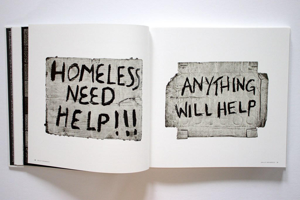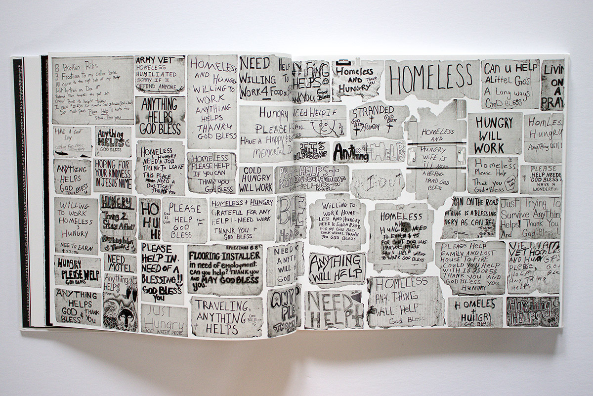 By the way, how did Black collect so many examples of panhandling signs? They are not something you usually find on the ground like gloves. It is crazy to think of how much time and effort he must have invested in his seemingly obsessive travel and research – maybe more akin to a quest. Six years. 100,000 miles. 46 states. 1,200 communities. 3,000 objects collected and photographed. Geez. The scale is hard to imagine.