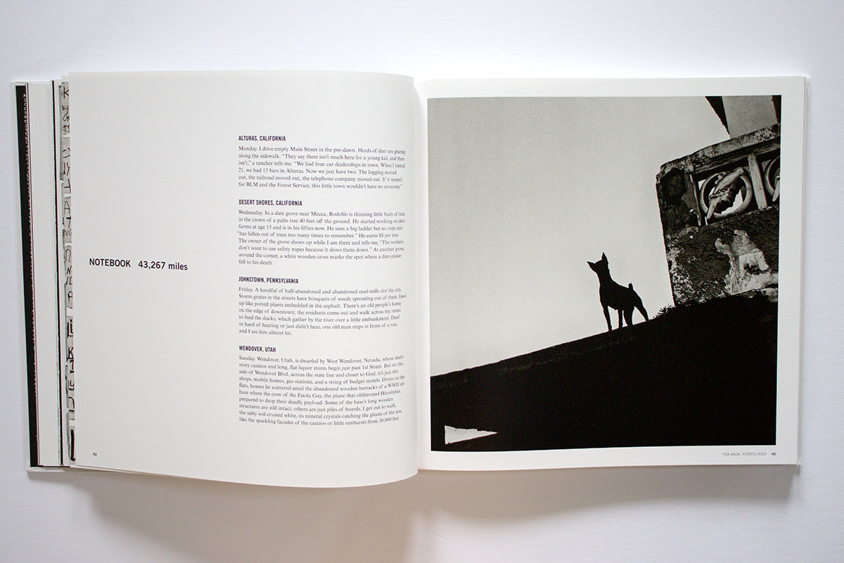 Next there is an “Interview” spread of two pages that focuses on a single person’s story of navigating poverty, then a “Voices” section with notable quotes from various people he met.