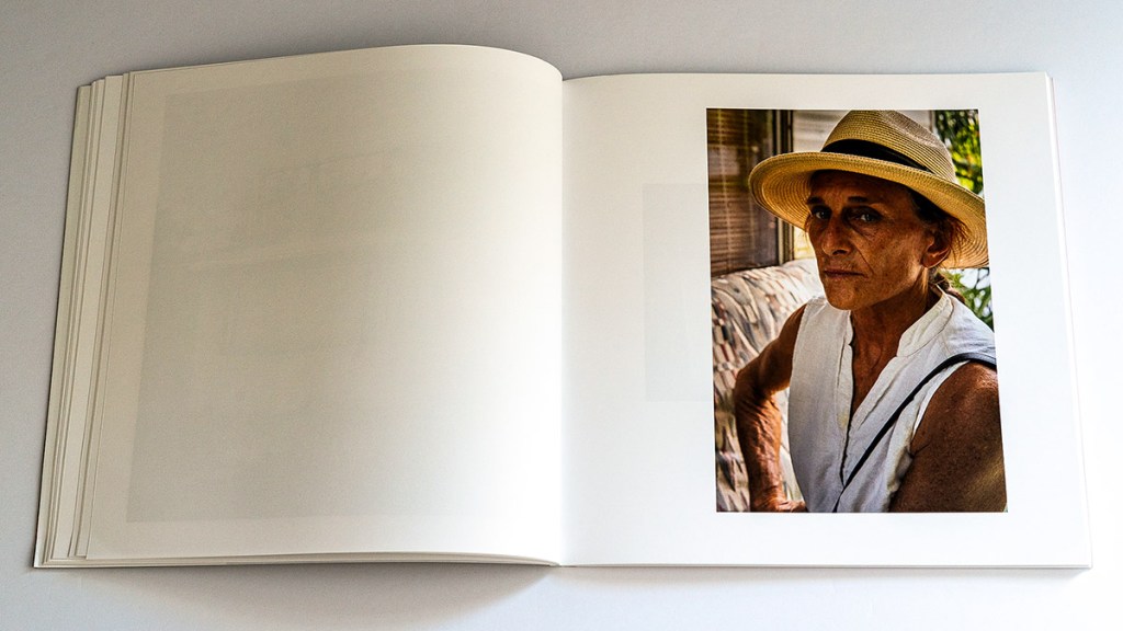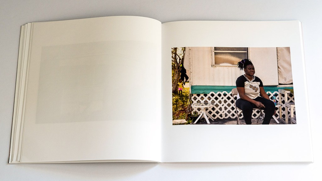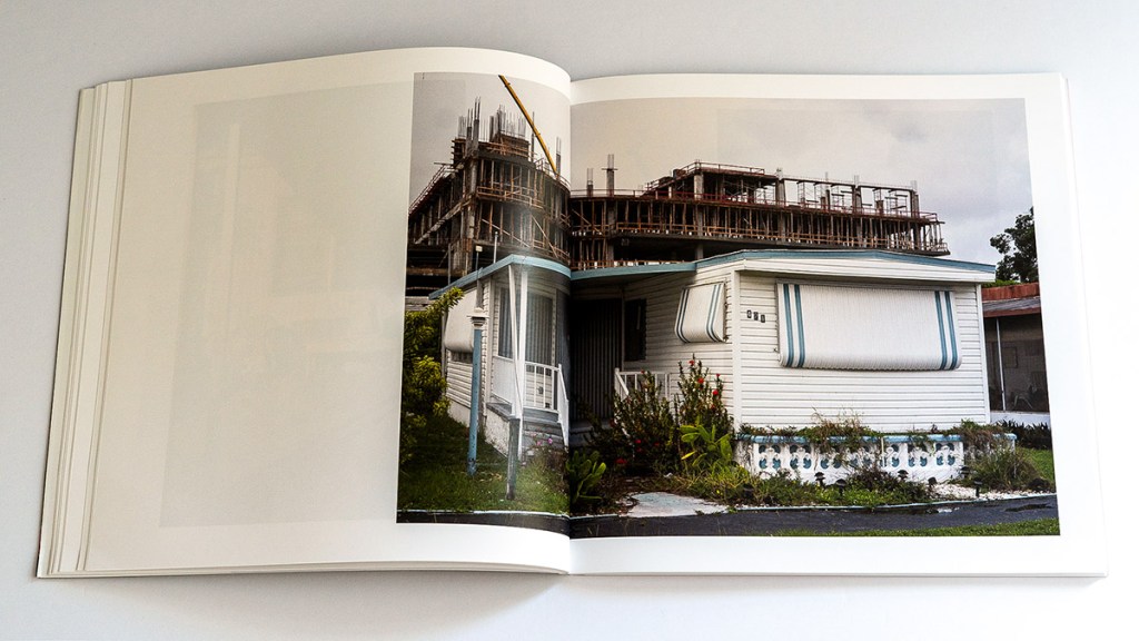 Waisman’s photobook, set in South Florida, likewise evokes these feelings and provides us with some answers about what is at stake. Through a number of resident portraits, we are asked to reckon with the fact that the displacement of manufactured home parks means the displacement of people. This point was best driven home, I thought, by a pair of photos found midway through the book. In one, a manufactured home is dwarfed by a new condo building, still under construction, but threatening to grow indefinitely taller. This is immediately followed by the second photo: a striking portrait of a woman in a Panama hat. With her grey-blue eyes, the subject gives the camera and the reader a contemplative, perhaps disapproving, sidelong look. The inclusion of portraits is made all the more powerful by the fact that photos of the homes and wider parks are, otherwise, almost entirely absent of people, leading the reader to feel as though they are observing a ghost town just before it is replaced by something new.