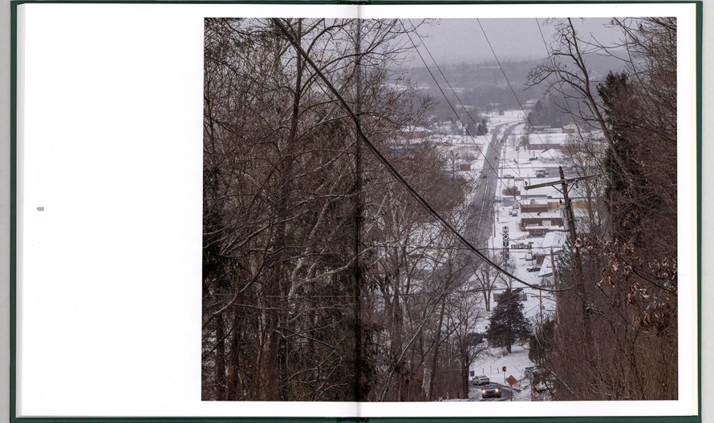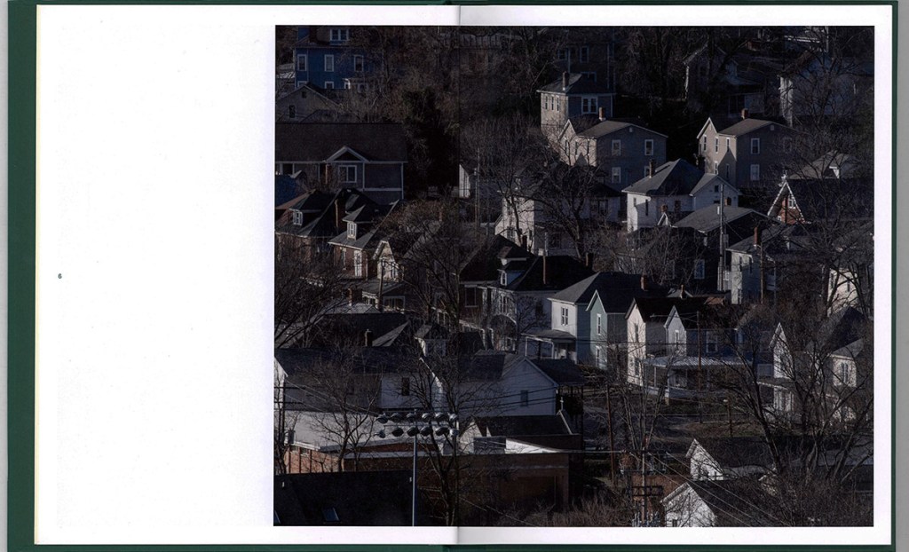 The early pages establish Athens through its terrain. Shown are houses stacked along a wooded hillside, compressed against the steep Appalachian landscape, suggesting layered habitation: students, landlords, long-time residents, and temporary tenants occupying the same space. This image is followed by a portrait of a young person standing alone on an empty road wearing roller skates. The pairing introduces one of the book’s central tensions: density versus isolation. The town appears structurally crowded yet emotionally sparse.
