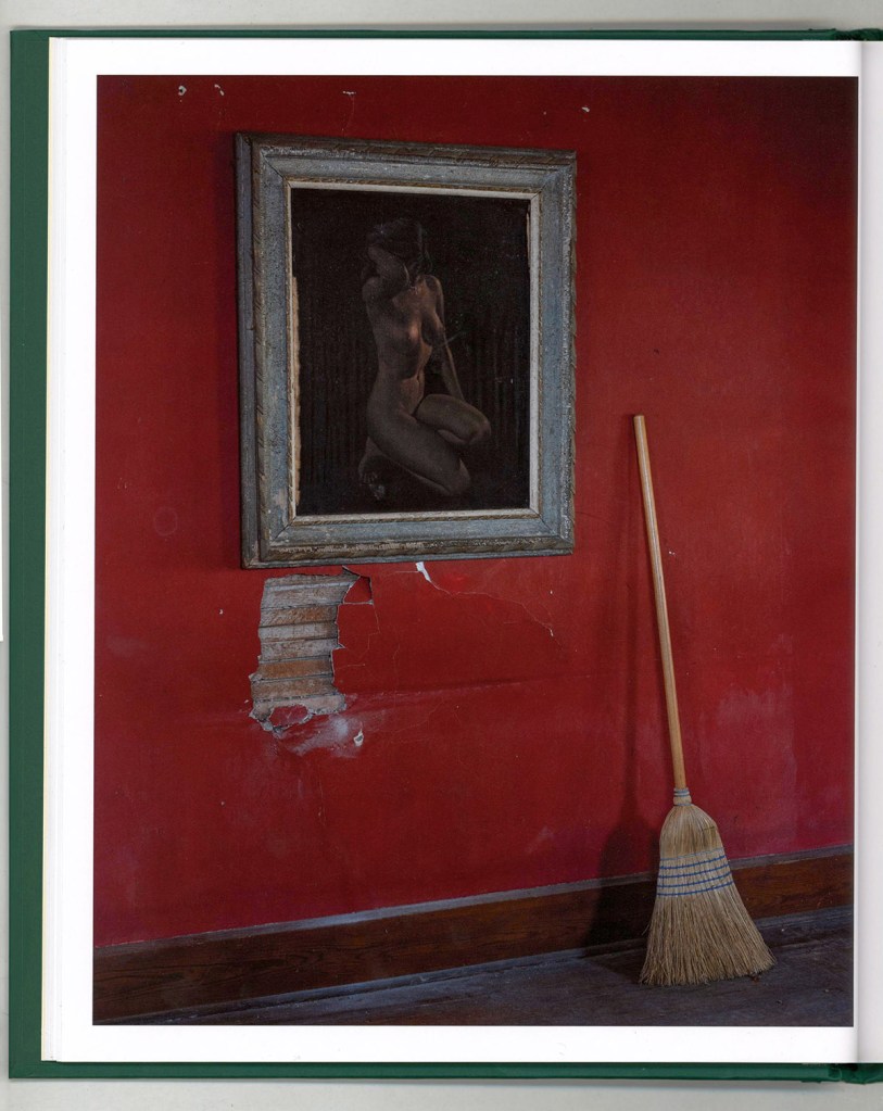 Another subtle moment occurs with a still-life image of a framed painting on a red wall beside a broom leaning against cracked plaster. Positioned between portraits, the photograph reads metaphorically: the broom suggests maintenance while the damaged wall hints at economic strain, forming a quiet allegory for the town itself – careful upkeep within an aging structure.