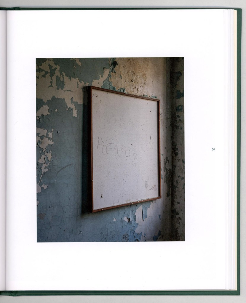 Still-life photographs assist the pacing. Window displays, such as artificial flowers visible through glass, and a blank frame with “HELP!” written on it mounted on a peeling wall function as visual punctuation marks. These images suggest private histories without fully revealing them, encouraging pauses within the sequence. At this point the viewer recognizes that the book constructs not only portraits of individuals but a broader social ecosystem shaped by the presence of Ohio University.