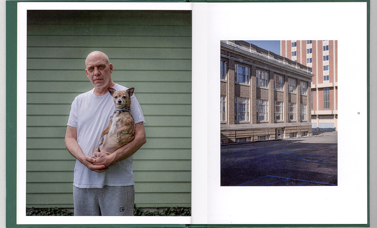 Several spreads demonstrate the photographer’s sensitivity to dialogue across the gutter. A portrait of a man holding a small dog before a pale green house faces a photograph of an institutional building and parking area. The juxtaposition contrasts domestic intimacy with institutional scale, the meaning emerging only across the double page.