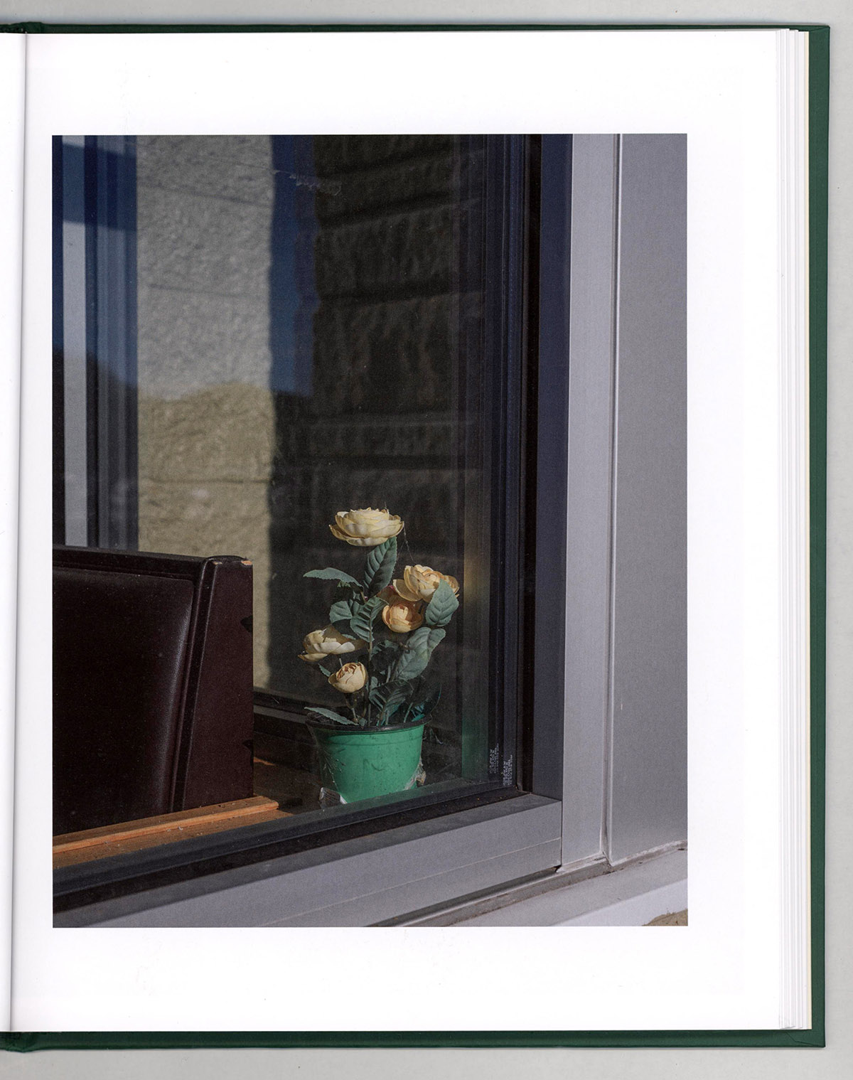 Still-life photographs assist the pacing. Window displays, such as artificial flowers visible through glass, and a blank frame with “HELP!” written on it mounted on a peeling wall function as visual punctuation marks. These images suggest private histories without fully revealing them, encouraging pauses within the sequence. At this point the viewer recognizes that the book constructs not only portraits of individuals but a broader social ecosystem shaped by the presence of Ohio University.