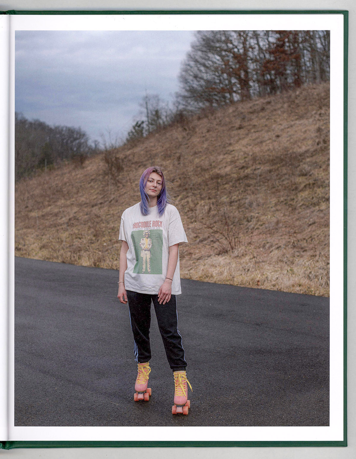 The early pages establish Athens through its terrain. Shown are houses stacked along a wooded hillside, compressed against the steep Appalachian landscape, suggesting layered habitation: students, landlords, long-time residents, and temporary tenants occupying the same space. This image is followed by a portrait of a young person standing alone on an empty road wearing roller skates. The pairing introduces one of the book’s central tensions: density versus isolation. The town appears structurally crowded yet emotionally sparse.