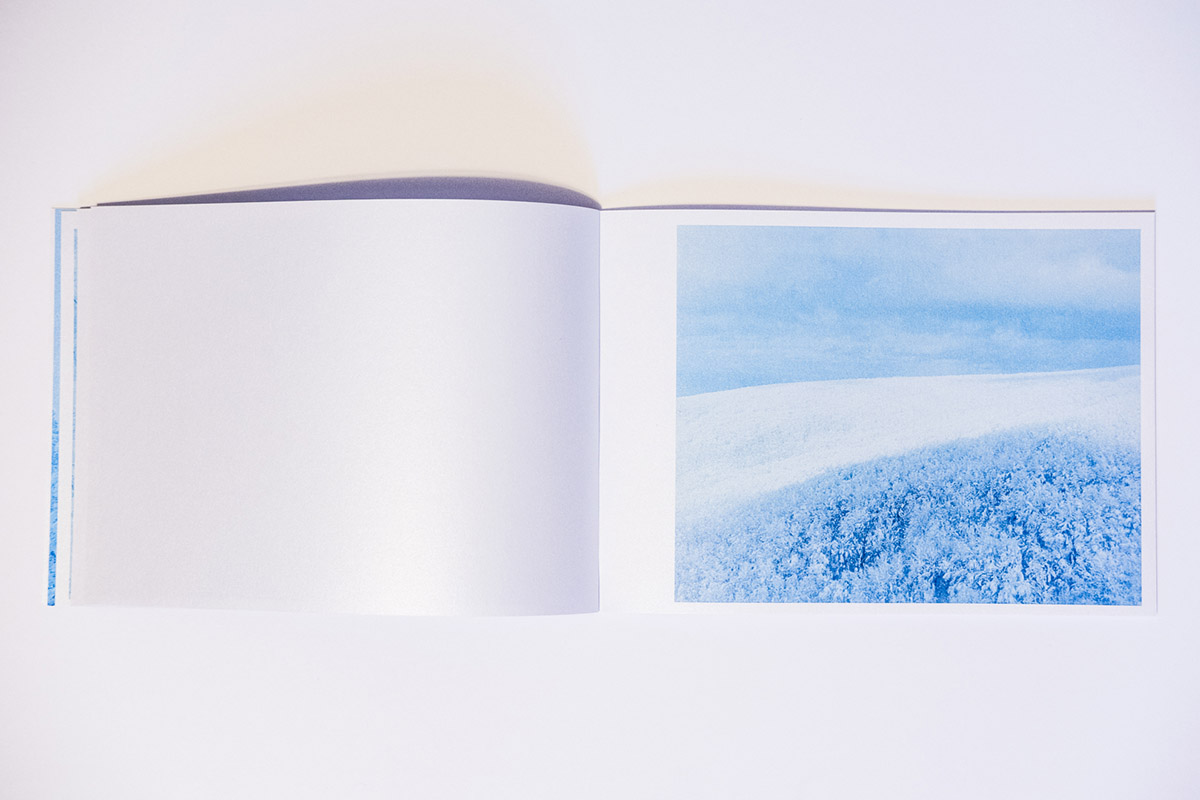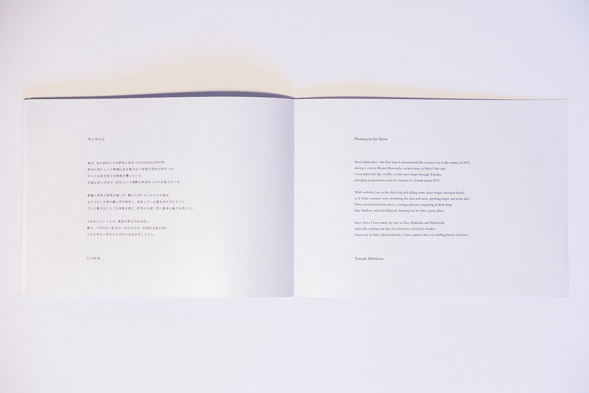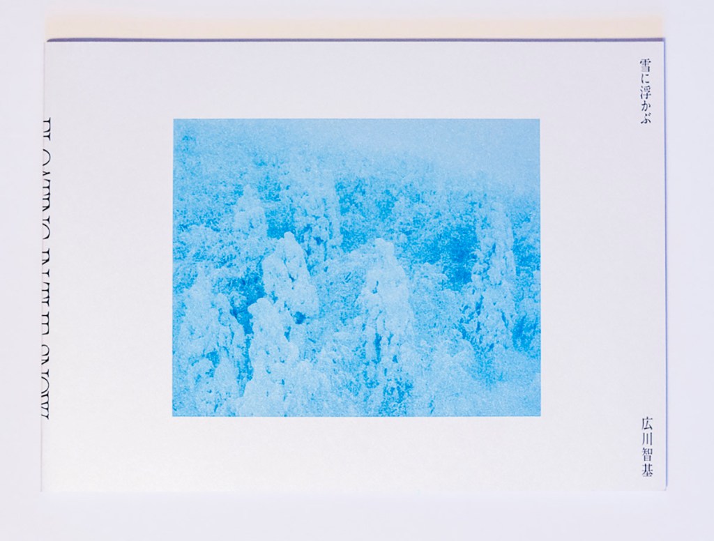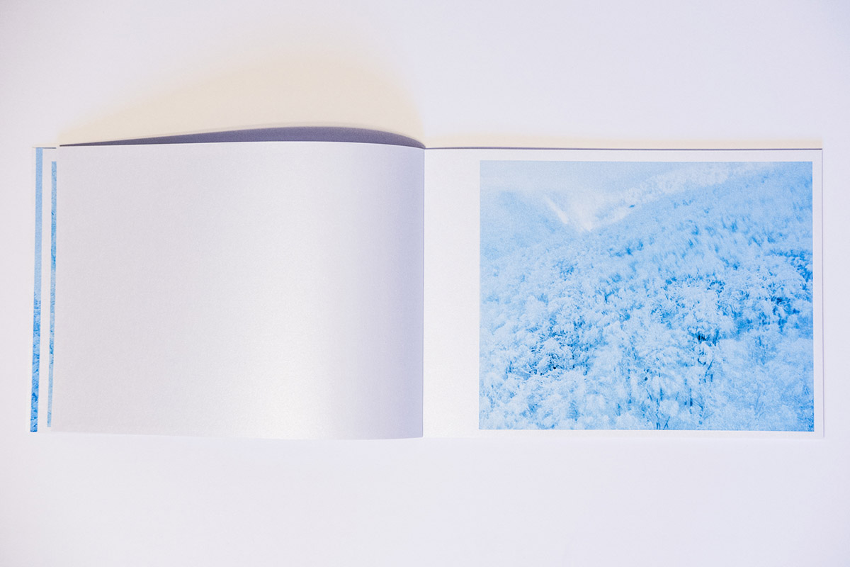 Within a plywood shelf near the floor, a sparkle catches my eye. Looking closer, I cannot read the words on the spine. This is how I encountered Floating in the Snow (you must open the entire book, exposing the full spine to see the words) by Japanese photographer Tomoki Hirokawa. Released in 2025 under his own imprint, the photobook is about the locations of Mount Moriyoshi, Tohoku, Mount Zao, and Hakkoda, all roughly in North-central Japan. While some of the locations, like Mount Moriyoshi, are known for the “snow monsters,” or “Juhyo” in Japanese, that develop as the trees become caked in snow amidst the depths of winter, in my correspondence with the author, he described it in the following way: it is a “natural phenomenon that forms when various conditions—such as temperature differences, humidity, and wind—come together, causing snow and ice to accumulate on trees. Mt. Moriyoshi in Akita, Mt. Zao in Yamagata, and Mt. Hakkoda in Aomori are known as the three major locations in Japan where this phenomenon can be seen.” While these sites are exceptional in their own right, Hirokawa has managed to transform them further through a combination of his distinctive images (made over several years, 2013-2019), color palette, and the printing techniques used in this project.
