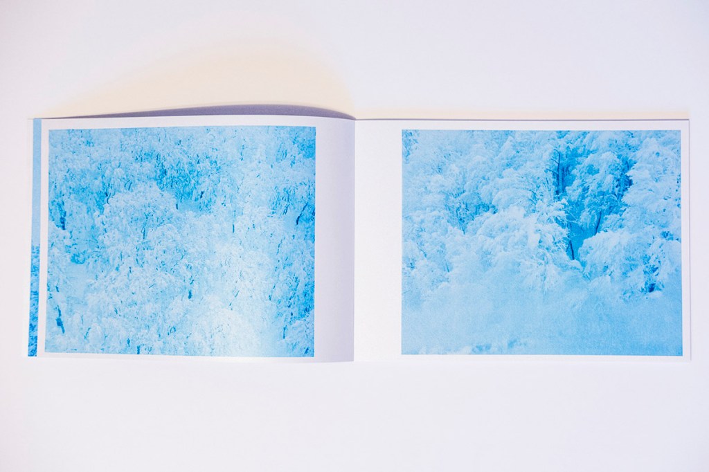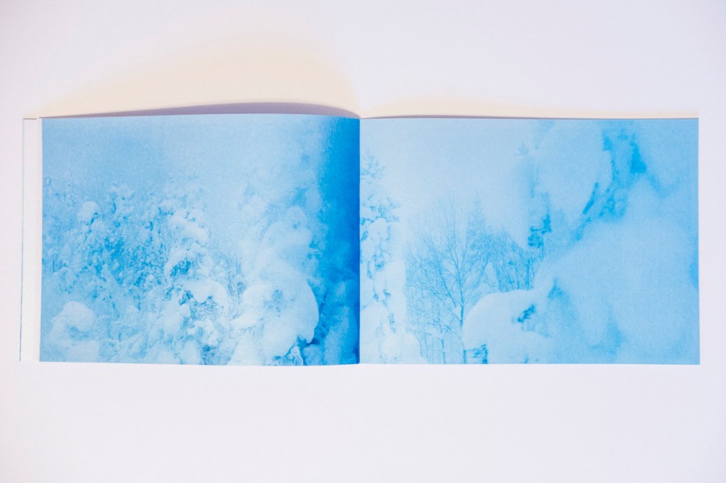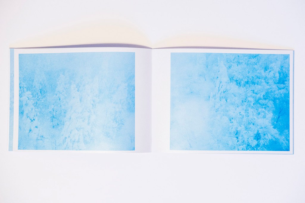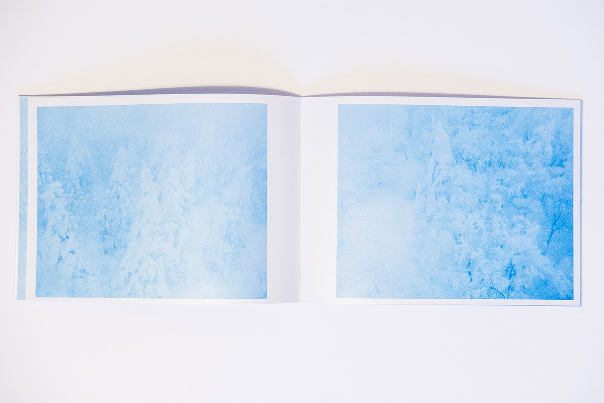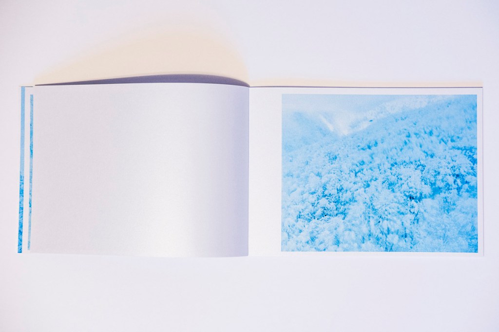 The first aspect one notices about Floating in the Snow is the paper and its tactile qualities. At about 10 by 7 inches in size, this horizontal object is comfortable and lightweight in the hands. This is due to the judicious selection of images, at a total of 28 (29 if you count the cover image), but also the unique paper choice. The paper has the feel of a light cardstock that has been coated or impregnated with sparkling grains. One of the effects of this is the added luminescence that the paper provides the cool, hazy-blue images spanning the 48 pages that of course adds to both the sense of awe, but also mysterious characteristics of the snowy tree figures in a clever use of printing that is able to capture and convey the embodied sense of being on a Japanese mountainside that the images themselves might not have achieved.