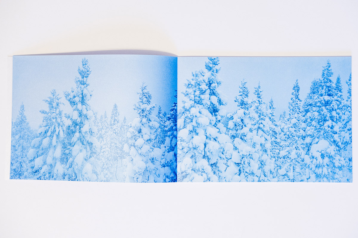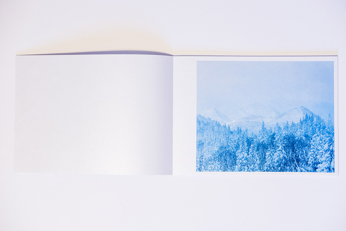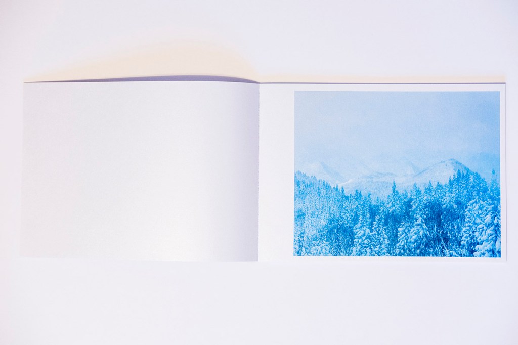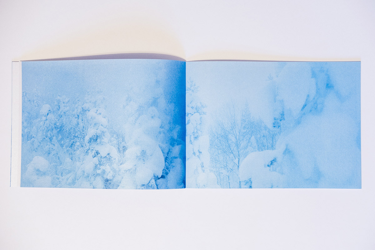 The first aspect one notices about Floating in the Snow is the paper and its tactile qualities. At about 10 by 7 inches in size, this horizontal object is comfortable and lightweight in the hands. This is due to the judicious selection of images, at a total of 28 (29 if you count the cover image), but also the unique paper choice. The paper has the feel of a light cardstock that has been coated or impregnated with sparkling grains. One of the effects of this is the added luminescence that the paper provides the cool, hazy-blue images spanning the 48 pages that of course adds to both the sense of awe, but also mysterious characteristics of the snowy tree figures in a clever use of printing that is able to capture and convey the embodied sense of being on a Japanese mountainside that the images themselves might not have achieved.