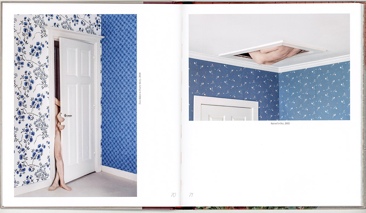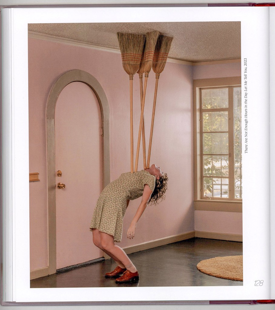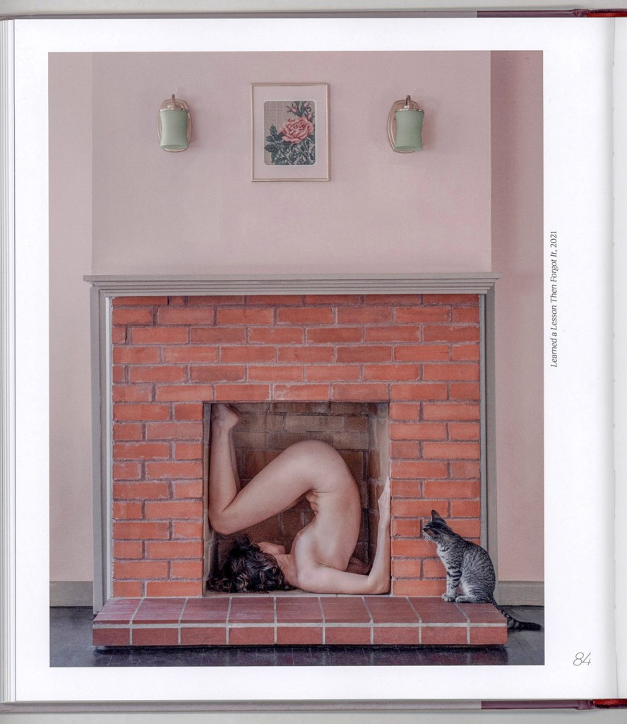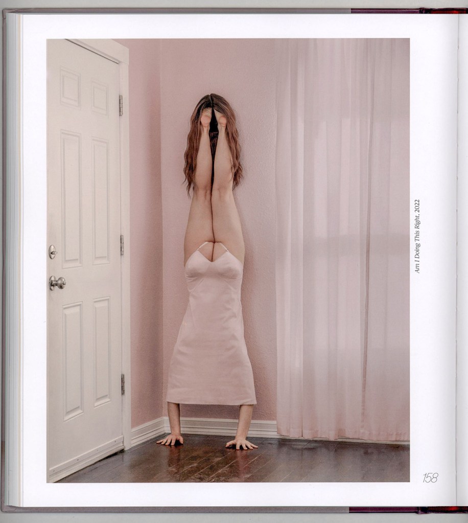 The image on page 39 extends this logic into the domestic sphere. The composition is balanced, almost conservative, yet a single implausible action quietly destabilizes the entire frame. The effect is cumulative rather than immediate. On page 51, the figure appears to negotiate physically with space itself, bending or compressing in ways that feel both deliberate and involuntary. Page 64 sharpens the contradiction further – an arrangement that cannot be reconciled through conventional perspective, yet remains grounded in natural light and believable texture. It is precisely this insistence on photographic realism that sustains the work’s tension.