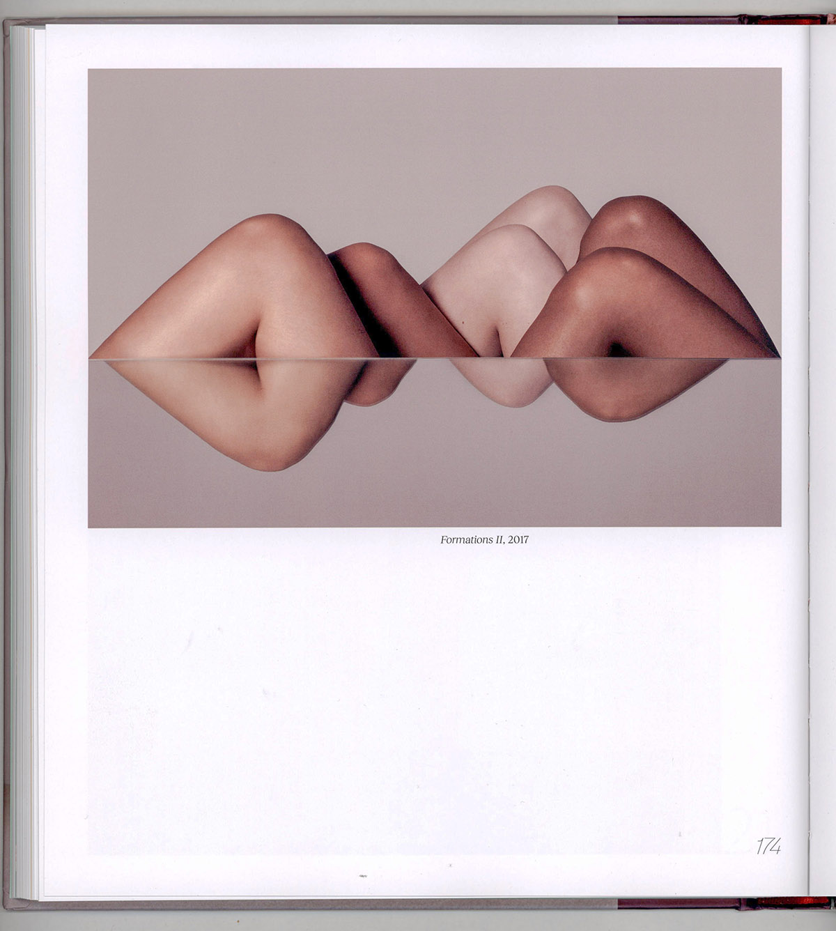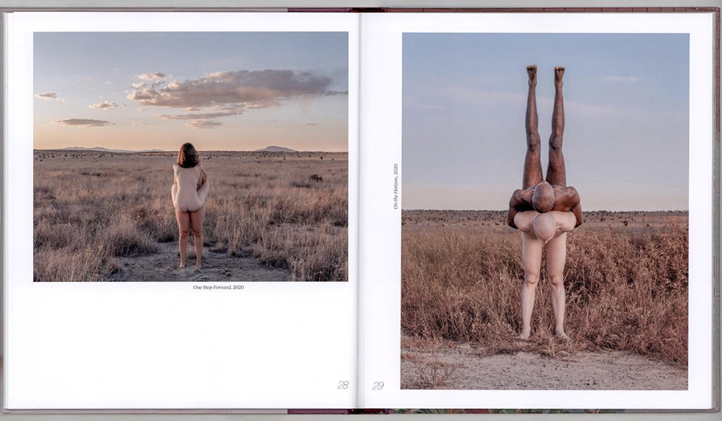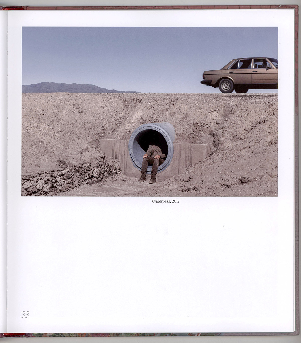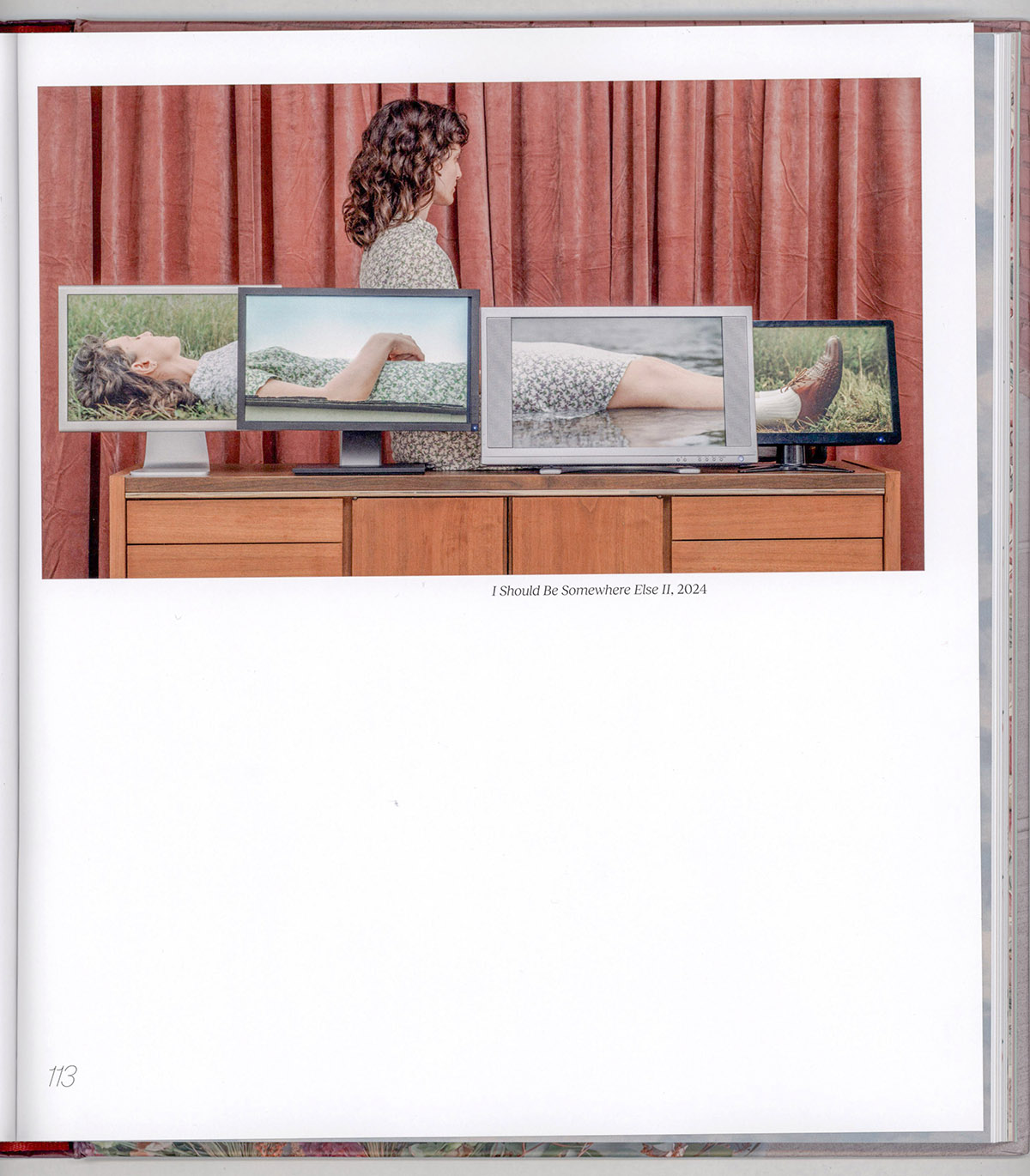 The image on page 39 extends this logic into the domestic sphere. The composition is balanced, almost conservative, yet a single implausible action quietly destabilizes the entire frame. The effect is cumulative rather than immediate. On page 51, the figure appears to negotiate physically with space itself, bending or compressing in ways that feel both deliberate and involuntary. Page 64 sharpens the contradiction further – an arrangement that cannot be reconciled through conventional perspective, yet remains grounded in natural light and believable texture. It is precisely this insistence on photographic realism that sustains the work’s tension.