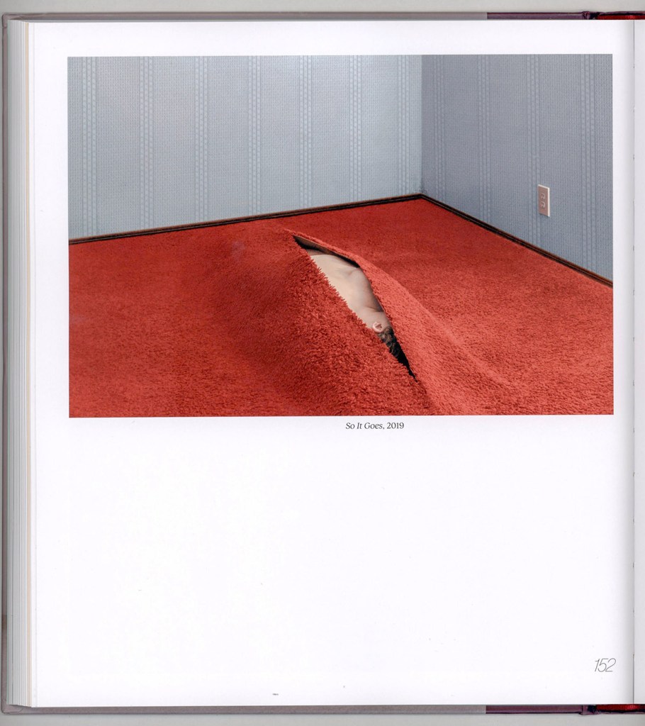 I will demonstrate the methodology through examples from the photobook. From the outset, the sequencing establishes its premise: the familiar is not stable. DiDonato’s surrealism is anchored in the textures of lived space. Walls, carpets, doorways, and fixtures are not passive backdrops but active participants in the image logic. The artist introduces interventions in minute doses, allowing the absurd to emerge through small violations of expectations rather than through overt spectacle.
