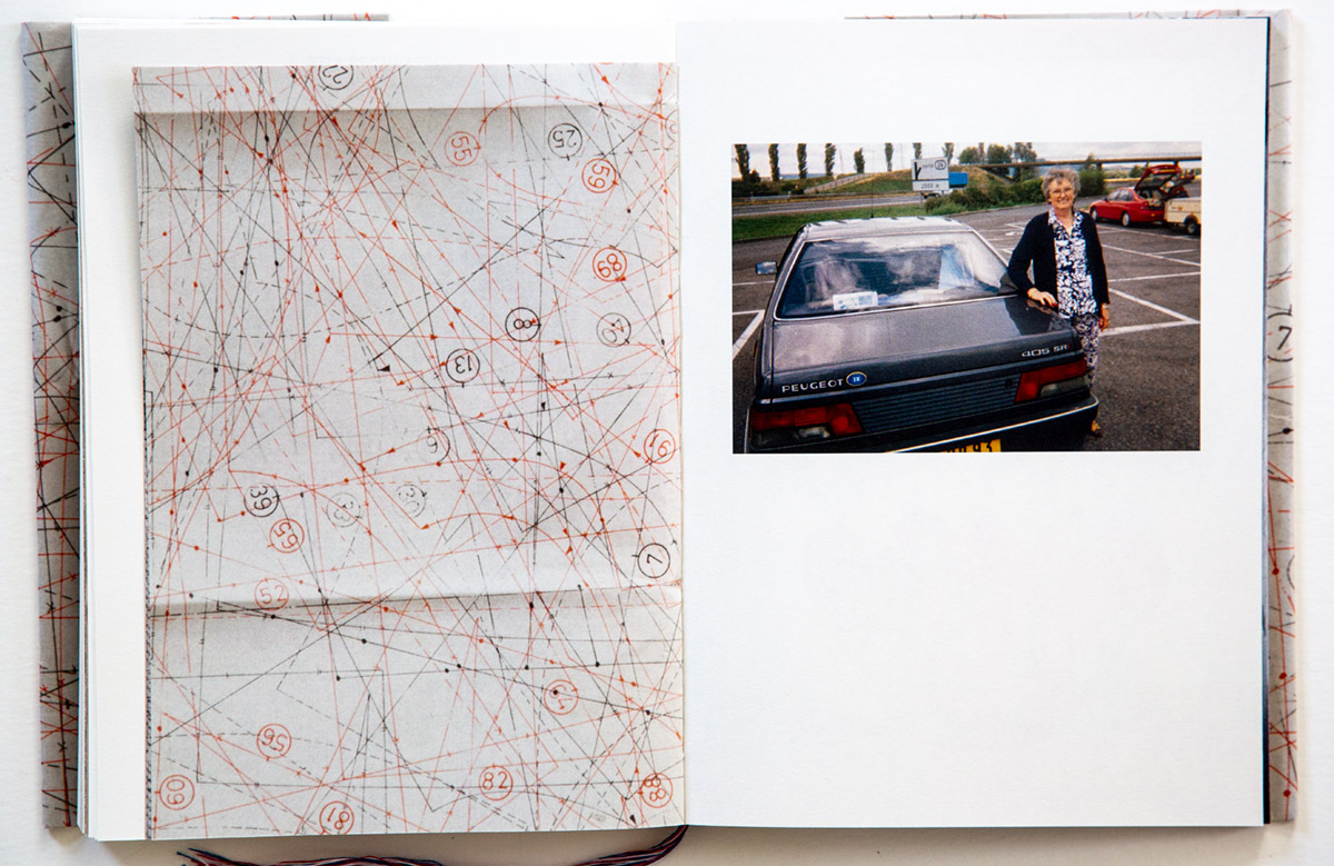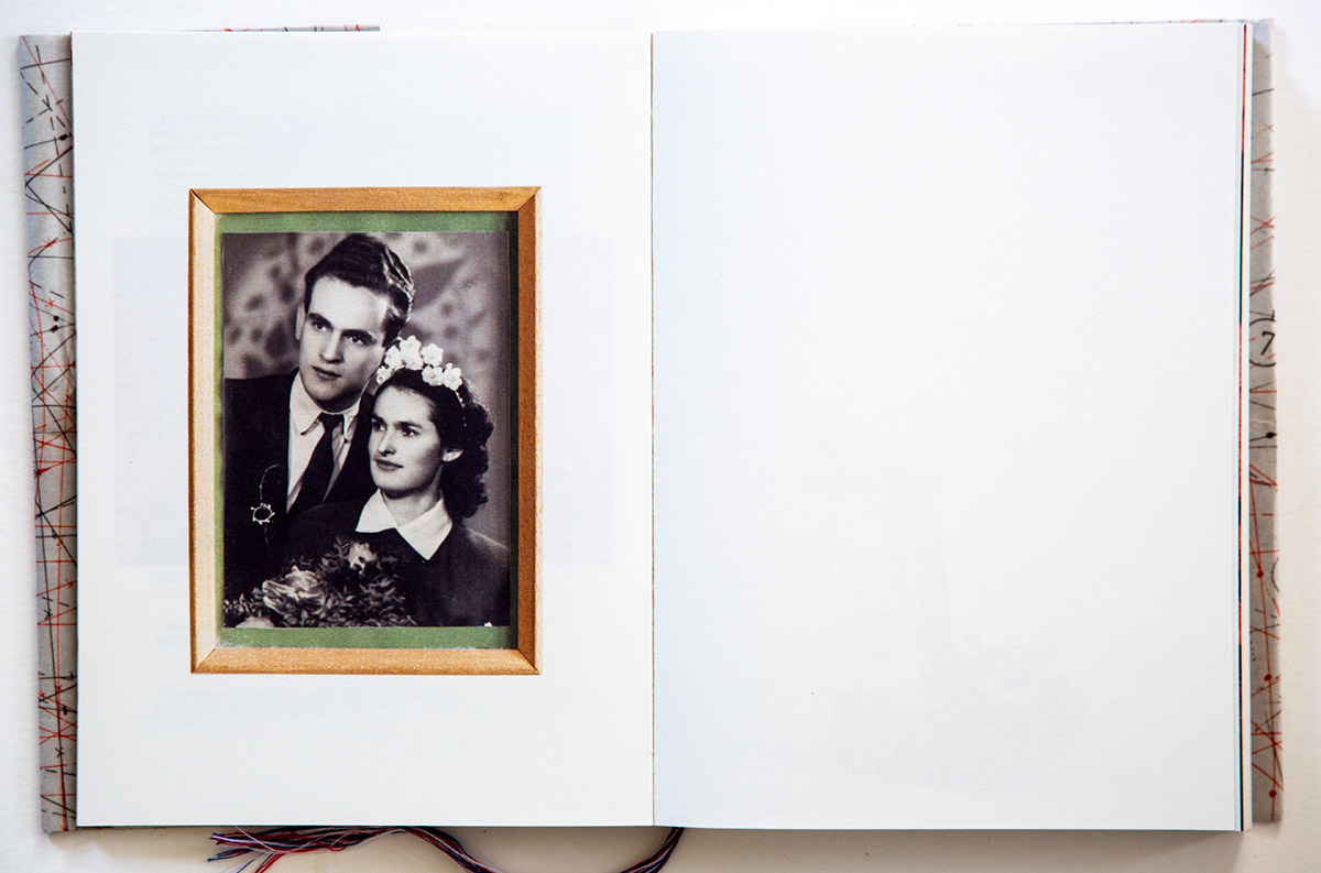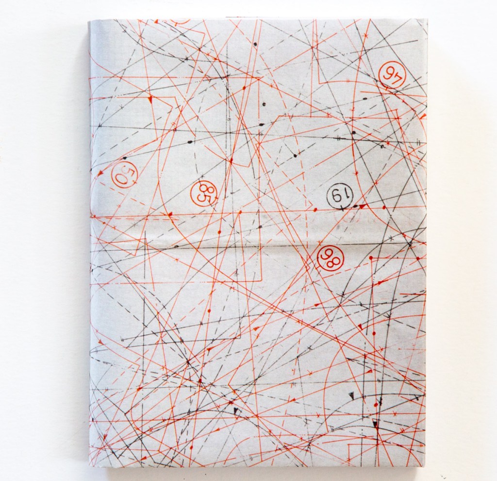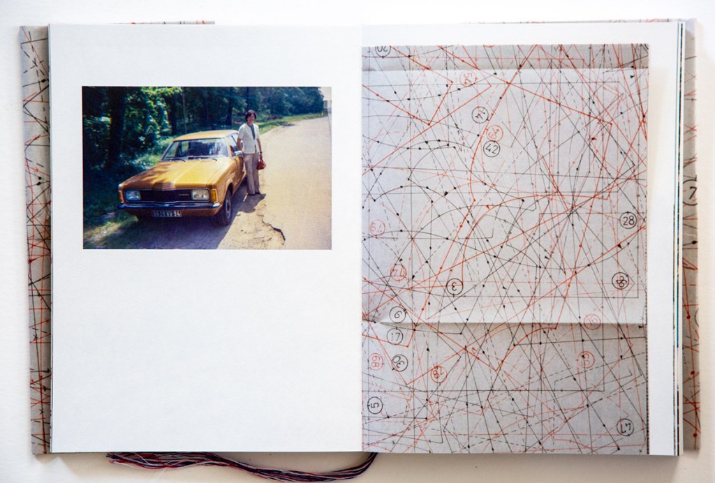 Interceded through this book are more mysterious clues; sewn in folded pages, one side a complex maze of lines and encircled numbers, perhaps a metaphoric road map, while on the reverse and inside the folds is printed a gray pattern of cross-stitching with some very small details in color. The cross-stitching might be something an individual would perform to pass the time or as a creative endeavor, yet another tantalizing detail about her grandparents. It made me think of the wooden lamp stands we have that were crafted by my grandfather who had a mysterious darken basement where all of his exotic wood turning equipment stood.