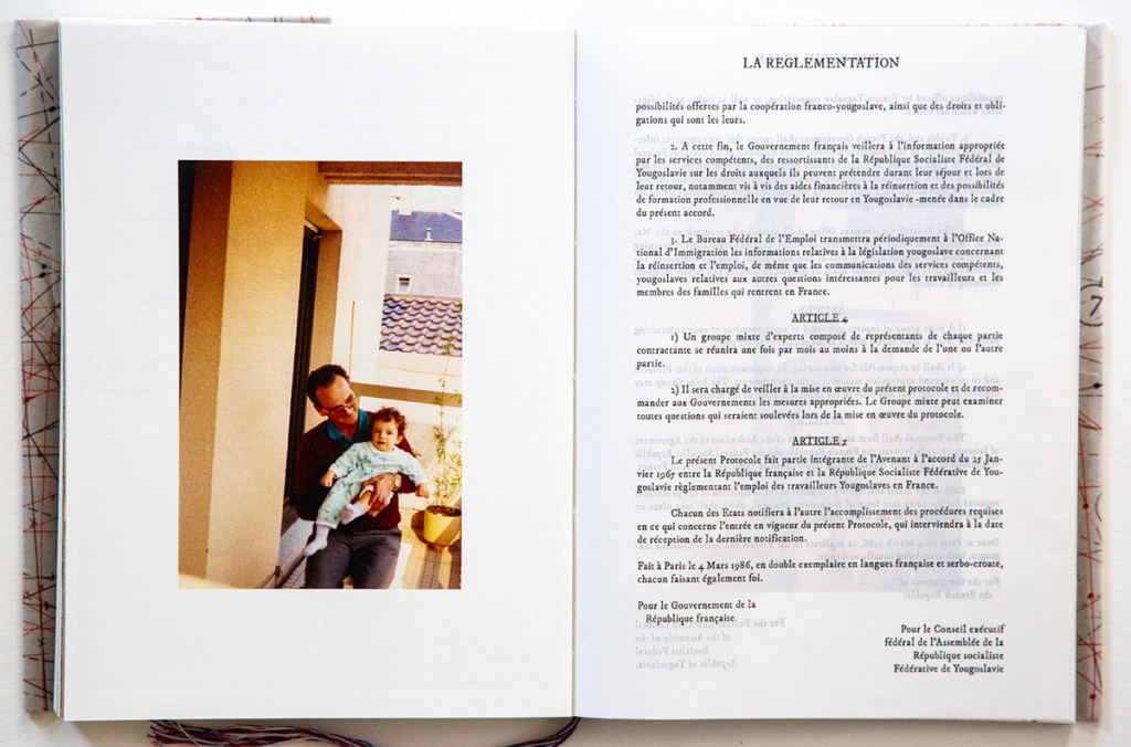 There is no introduction or afterward included in this book to help the reader, while if one investigates this book long enough, they may find a Rossetta Stone that can help provide some insight. On the surface, I found her visual dialog challenging to follow and understand and I can only think that is exactly what Cocano encountered as she continued her investigation. The colors of the flag of Yugoslavia, like that of France, is a tricolor of blue, white and red, are the colors of the treads that Cocano has chosen to hand-bind her artist book, yet another subtle symbolization for the fragile elements that hold and tie her memories together.